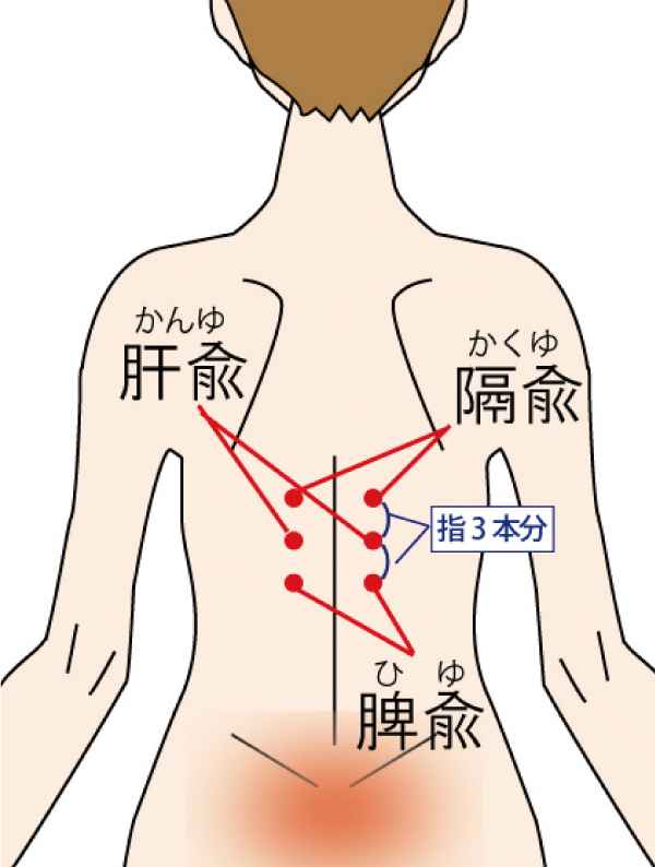 「膈俞」は肩甲骨の下の端と同じ高さにあります。「肝俞」はそこから指の腹を3本並べて下に下がった所です。「脾俞」はさらにそこから指の腹を3本並べて下に下がった所です。