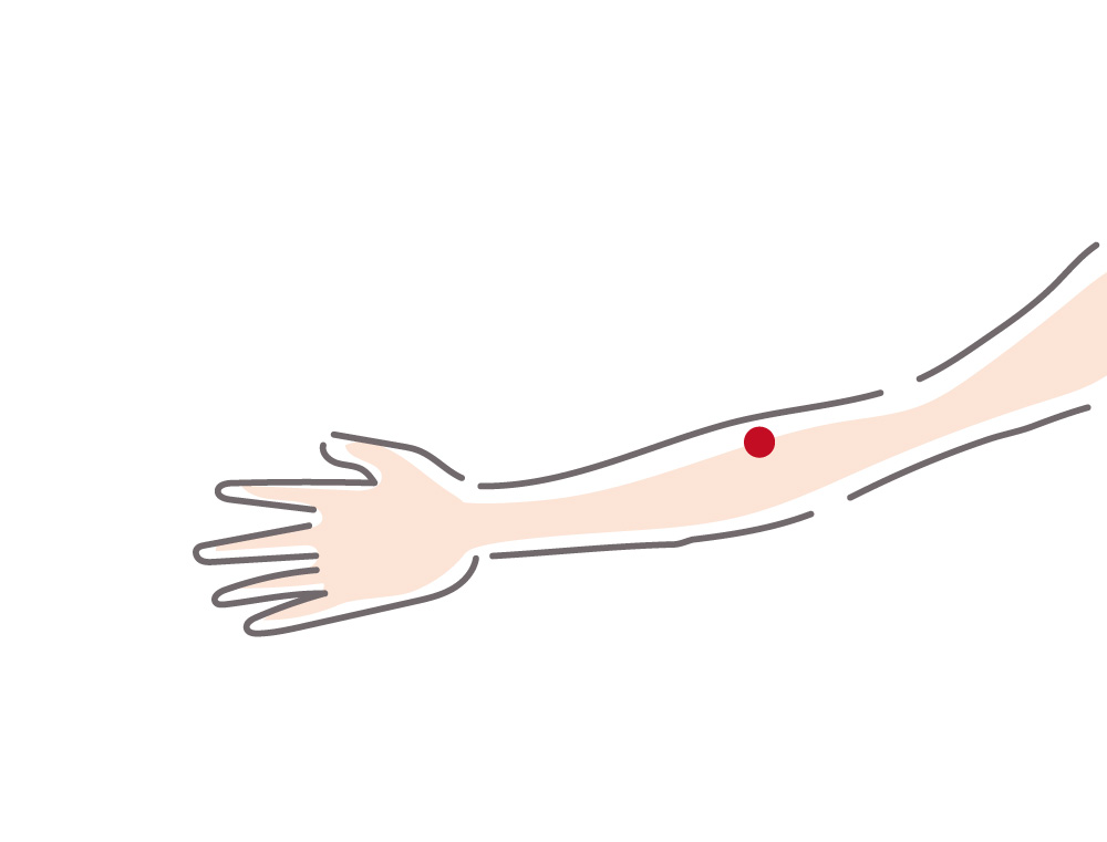 場所は、ひじの横ジワから手首の横ジワを結んだ線の中間点より、指幅1~2本分ひじ側にある、押すと痛いところです。
