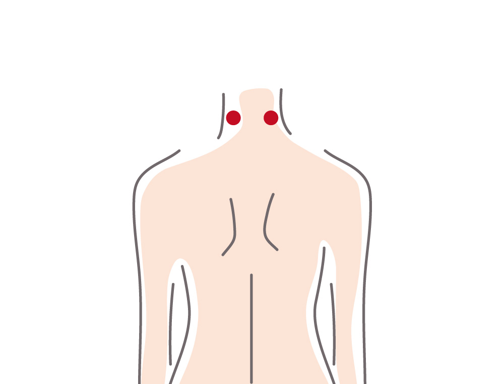 場所は、うつむいたときに首の付け根に現れる骨から指幅2本分上で、骨の両脇の痛いところや、しこりになっているところです。