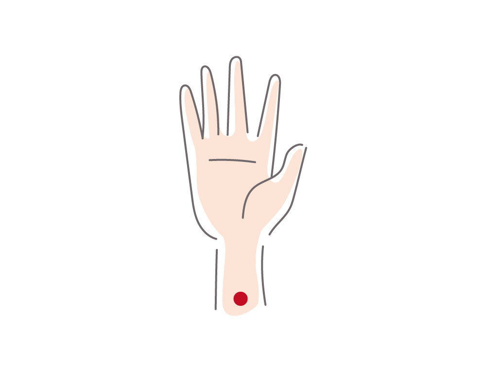 場所は、手のひらを上に向け、手首の横ジワの中間点に薬指を当てて、ひじ方向に指幅2~3本分の位置で、押すと痛いところです。