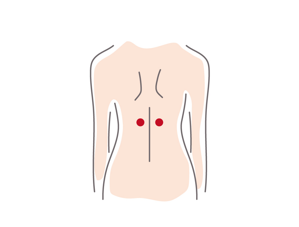 場所は、背骨と一番下の肋骨でできる角より少し上の高さで、背骨の中心から左右に指幅2本分の位置にある、押すと痛いところです。