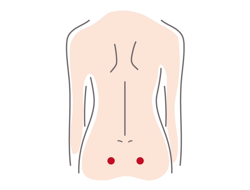 場所は、仙骨の上端からやや下、仙骨の中心線から左右に指幅2本分の位置で、押すと痛いところです。