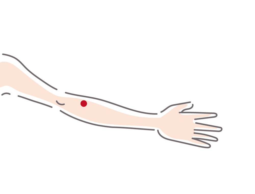 場所は、ひじを曲げるとできる横ジワの外端に人差し指の端を当て、手首方向に指幅3本分の位置にある、押すと痛いところになります。
